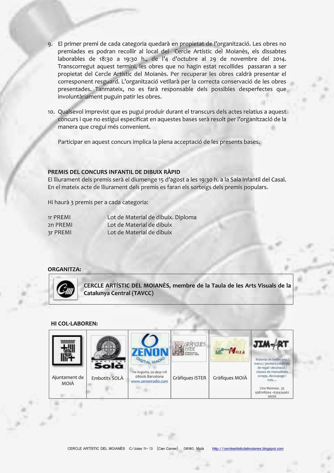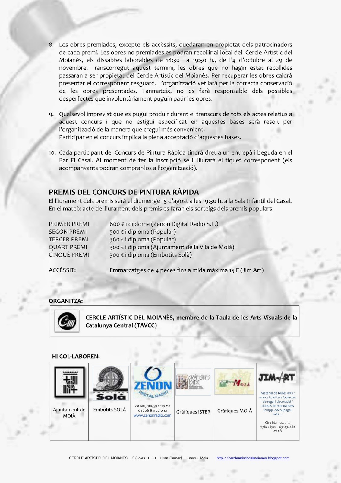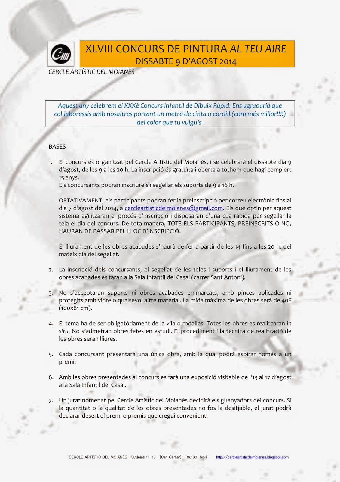 BASES DEL CONCURS DE PINTURA AL TEU AIRE i CONCURS DE DIBUIX RÀPID 24/07/2014 Concursos organitzats pel Cercle cercle artistic del moianes 0 Comentaris 9 D’AGOST 2014 MOIÀ COM CADA ANY… US HI ESPEREM!!! NOVA CONFERENCIA CERCLE ARTÍSTIC GUANYADORS DEL XLVIII CONCURS DE PINTURA RÀPIDA
