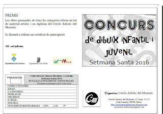 CONCURS DE DIBUIX INFANTIL I JUVENIL SETMANA SANTA 2016 21/02/2016 Uncategorized cercle artistic del moianes 0 Comentaris Ja et pots descarregar les bases del concurs! ESPEREM, COM CADA ANY, LA TEVA PARTICIPACIÓ!!! ATENCIÓ AQUEST ANY HI HA BOTIFARRADA, RESERVA LA TEVA PLAÇA Aquí enllaç bases JARDINS DE LLUM, NOU REPTE DEL CERCLE ACONSEGUIT VEREDICTE CONCURS DE SETMANA SANTA