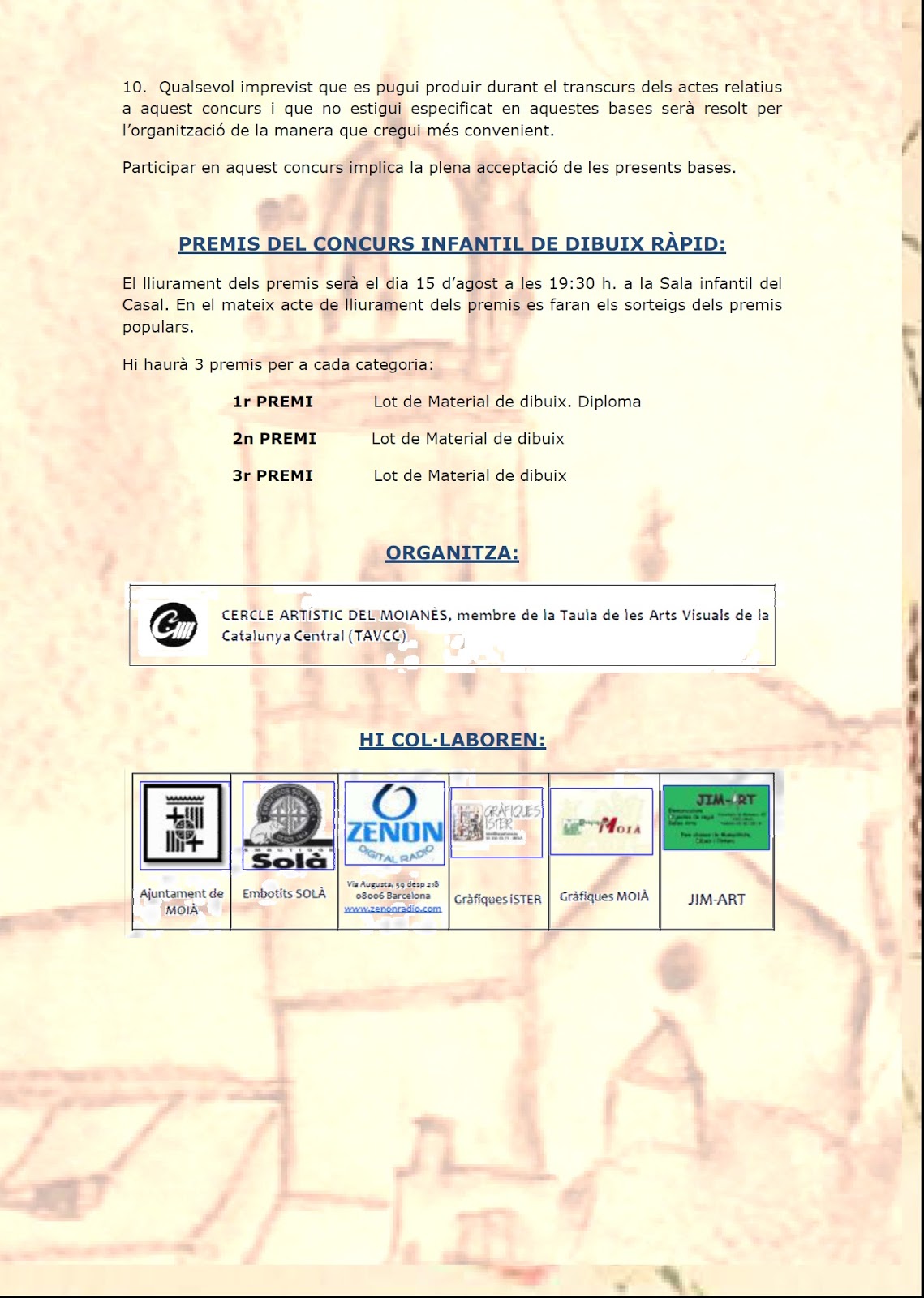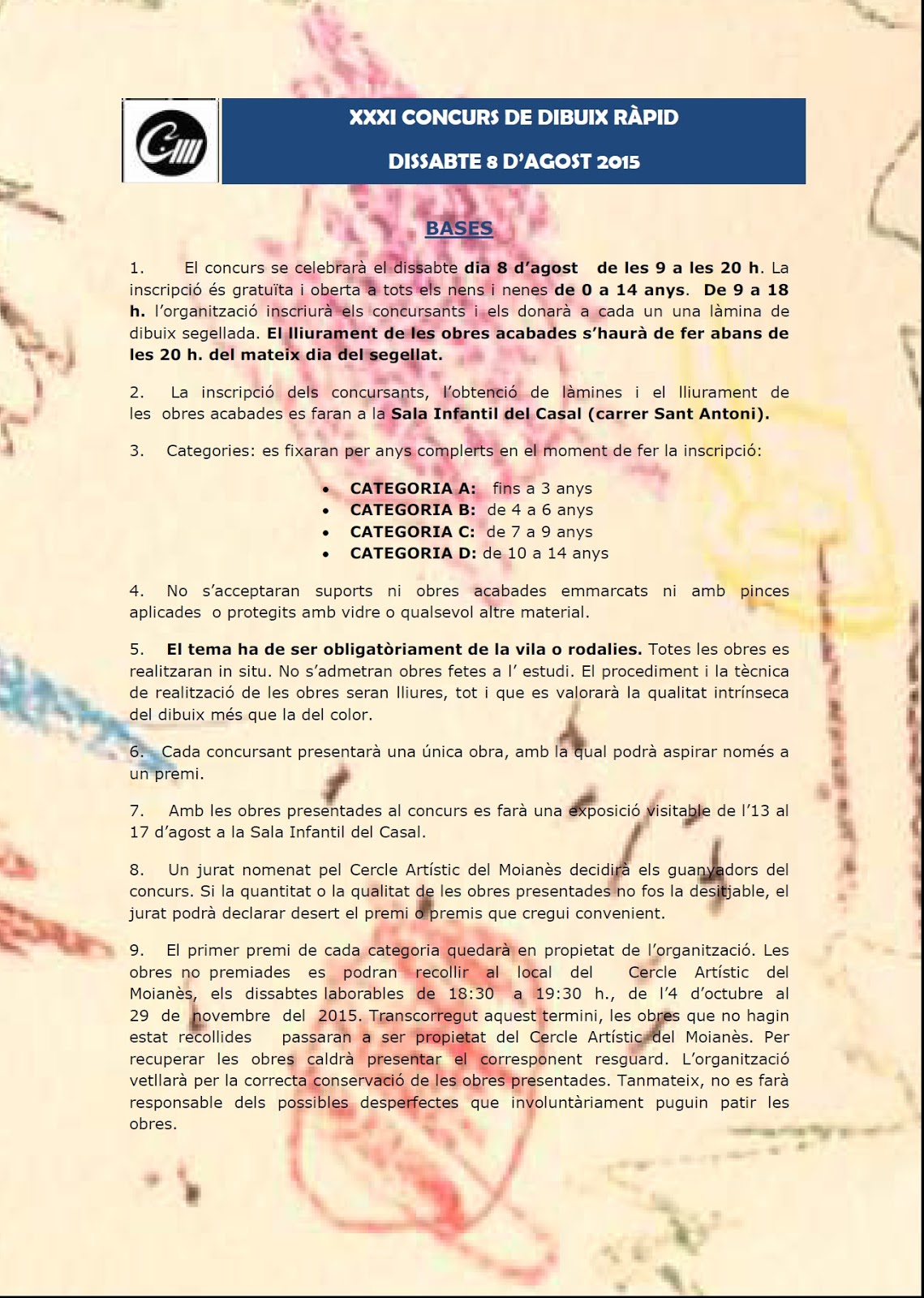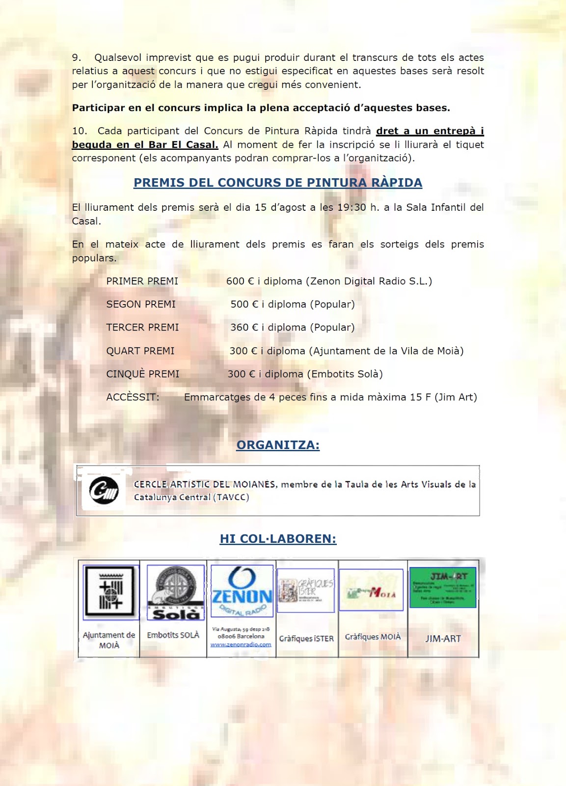XLIX CONCURS DE PINTURA AL TEU AIRE 19/07/2015 Concursos organitzats pel Cercle cercle artistic del moianes 0 Comentaris A continuació Bases del concurs de Pintura al Teu Aire i del Concurs de Dibuix Ràpid VEREDICTE CONCURS DE SETMANA SANTA VEREDICTE CONCURS PINTURA RAPIDA